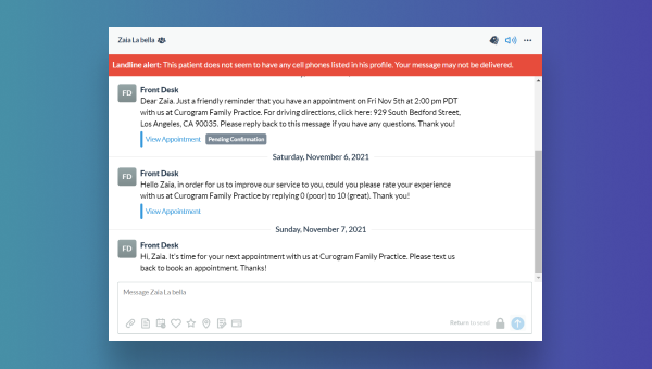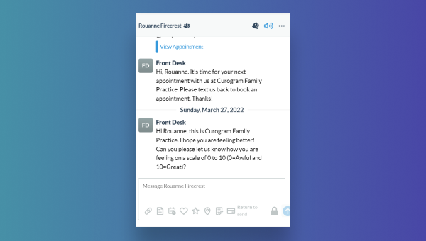 Curogram's HIPAA-compliant two-way texting features include: unlimited two-way texting, automated reminders, automated surveys and reviews, automated online patient forms, text-to-pay requests, missed call/voicemail to text, and telehealth.