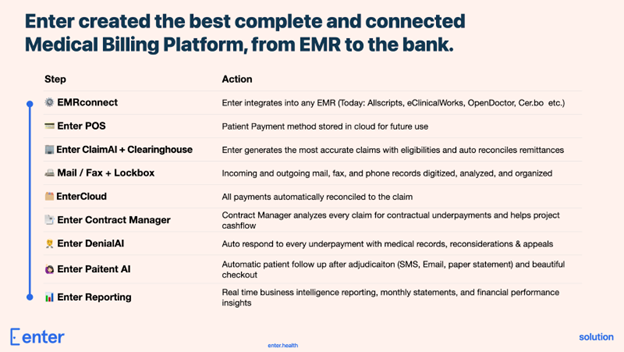 Enter’s holistic Revenue Cycle Management platform fully automates the entire billing process from EMR to the bank.