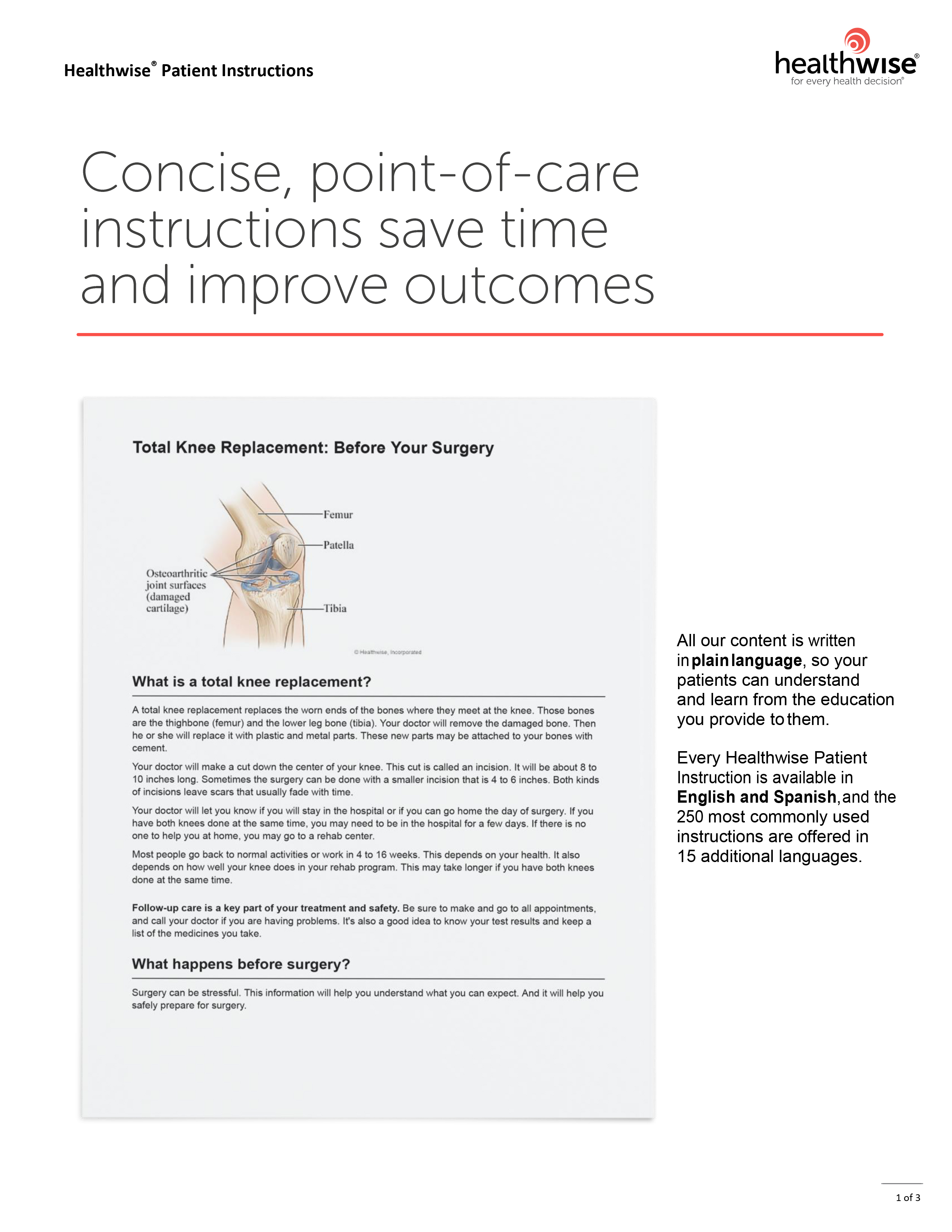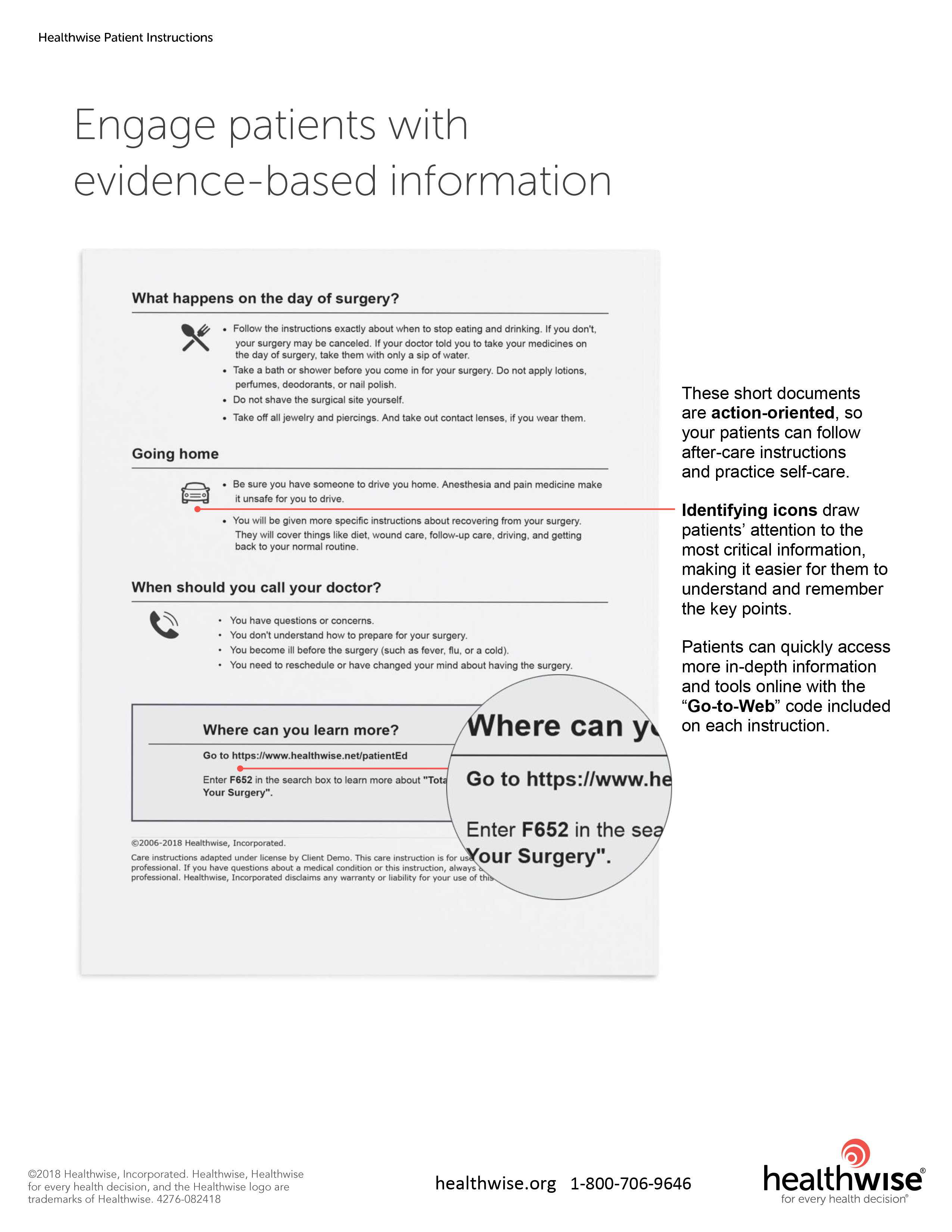Clinicians choose from over 3,500 patient instructions in English and Spanish, plus the 250 most commonly used topics in 15 additional languages, and over 600 “bite-sized” videos in English and Spanish that enhance patient understanding. Patient instructions include identifying icons to draw attention to important information, making it easier for patients to understand and remember key points. Patients can also access more information and tools online using the Go-To-Web URL in each document.