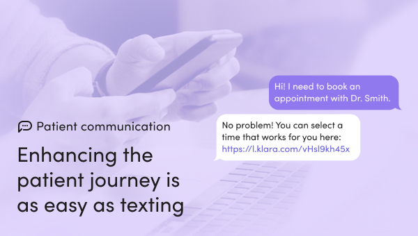 Klara helps free up staff resources by transforming phone volume into convenient, two-way messaging and helps improve operational efficiency by automating manual workflows. With Klara, your practice can enhance your patient’s healthcare experience through key interactions such as scheduling, appointment instructions, reminders, post-visit follow-ups and ongoing care.