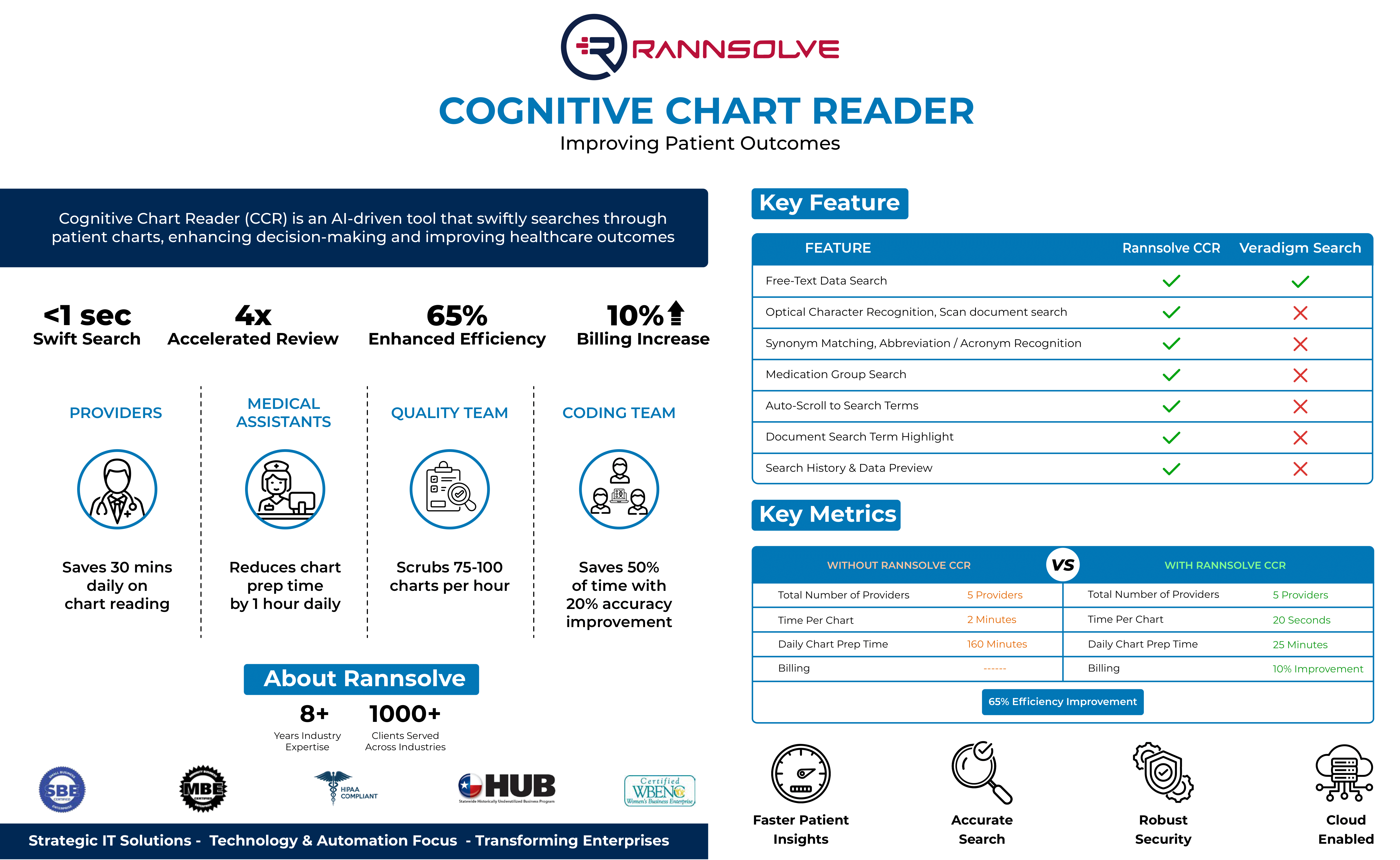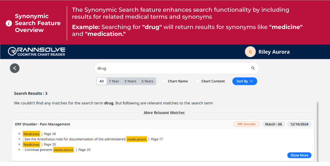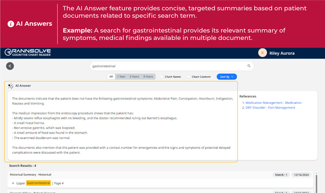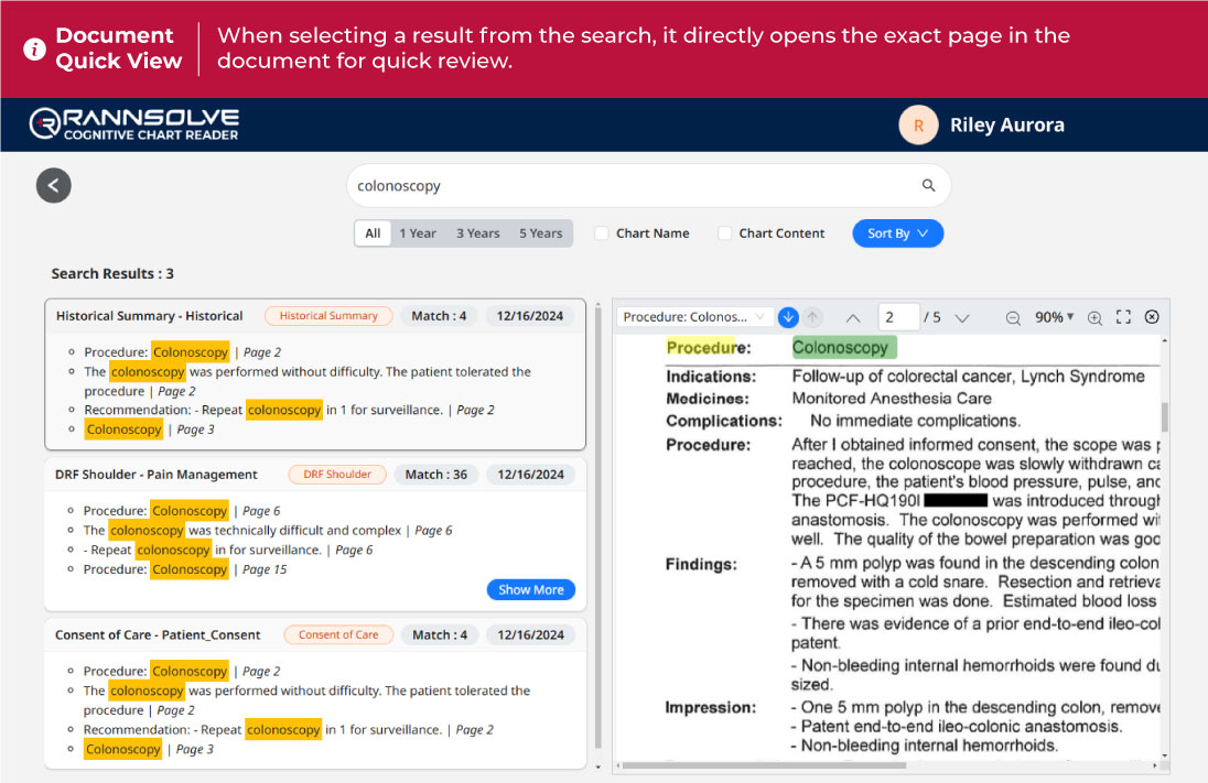 Rannsolve Cognitive Chart Reader is an AI based solution that enables providers to swiftly search through patient documents. Supports scanned documents, electronic, handwritten documents, and other formats.