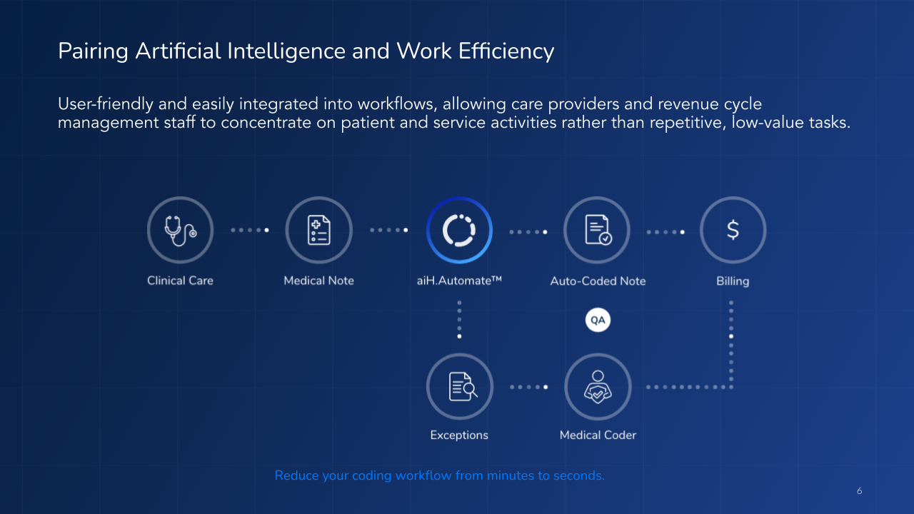 aiH.Automate™ deploys advanced deep learning and AI-ML models to transform clinical notes into CPT® codes. Our auto-coding engine sends completed encounters directly to billing while routing exceptions to coders for further review.
